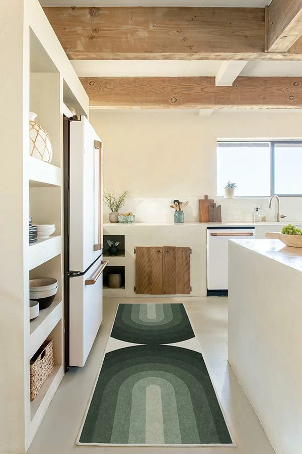 Alluring and abstract. Taking inspiration from Bahaus artist Josef Albers, this modern rug design features mirrored arches in shades ranging from dark hunter green to light sage on an off white backdrop. Water-resistant, stain-resistant, and machine washable.