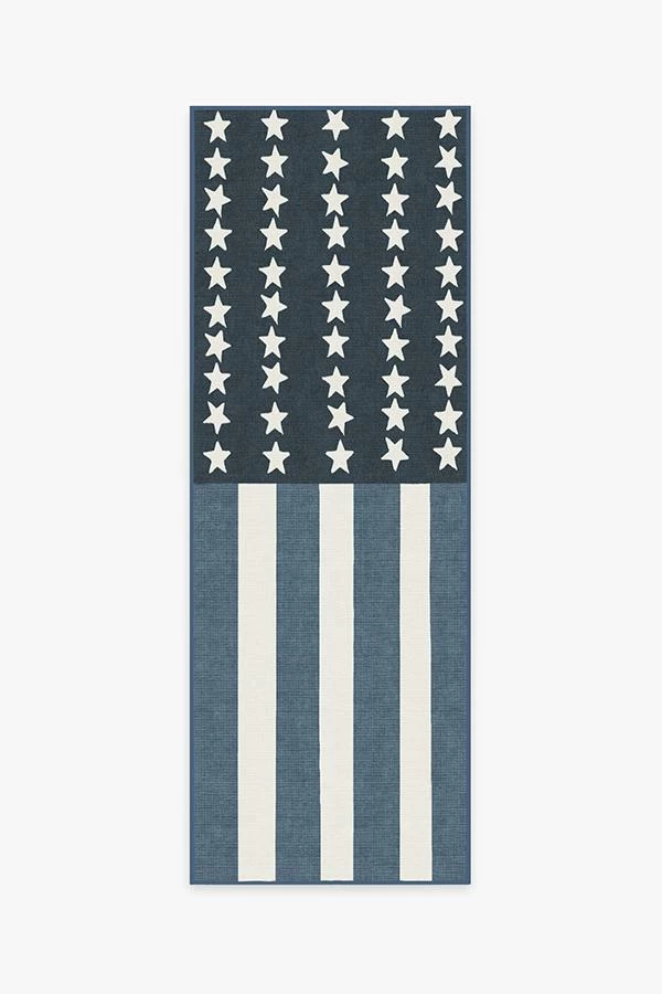 Our American Flag Blue Rug takes an edgy twist on Old Glory. This stars-and-stripes motif is washed in muted tones of slate blue and pearl, giving this iconic symbol a more contemporary feel.