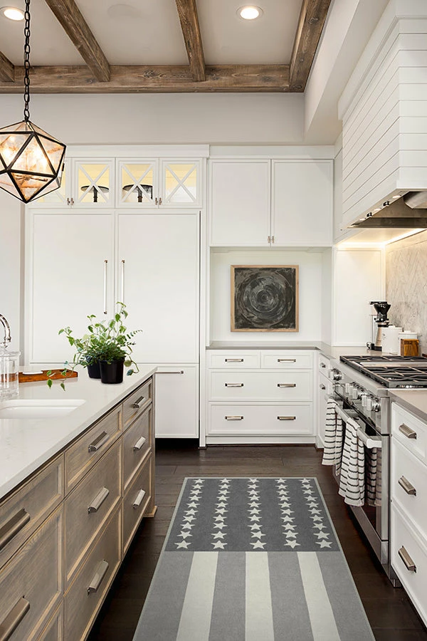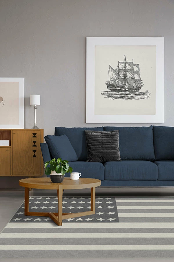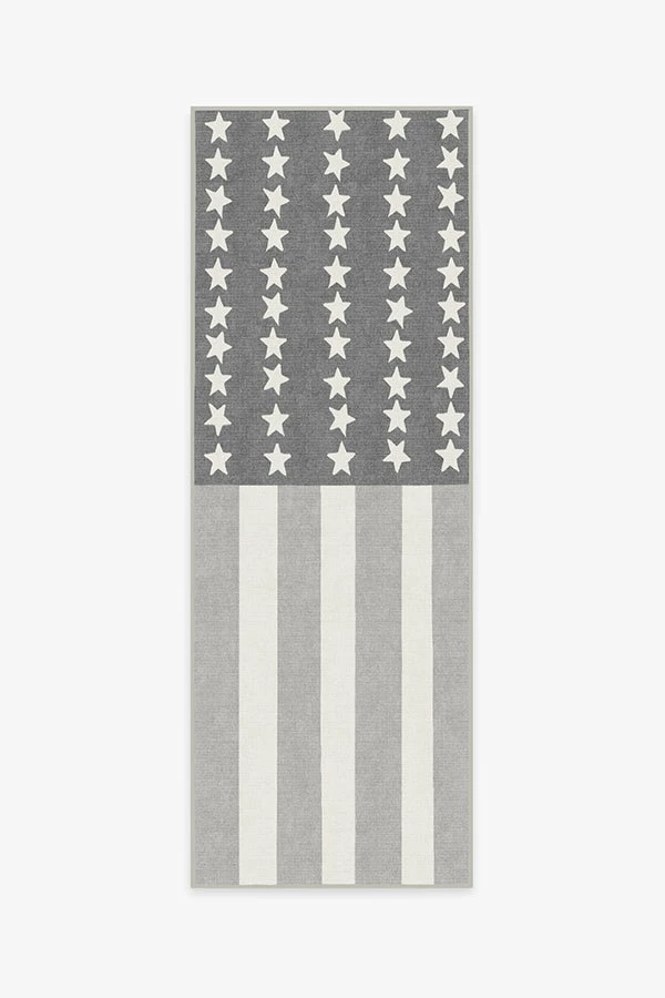 Our American Flag Grey Rug features the iconic stars-and-stripes design in monochromatic tones of grey, silver and pearl. Its modern look and understated color palette give this decorative accent a year-round appeal.