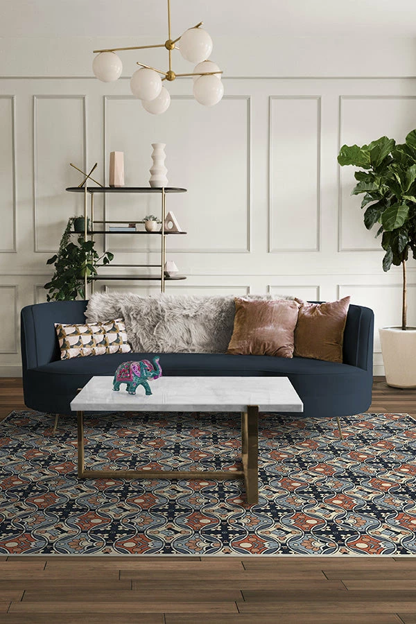 An eye-catching piece. Our Anna Sui Sullivan Navy Rug features a lively pattern reminiscent of stained glass window panes in hues of navy, cayenne, red, and cream set atop a navy background. Made from our water-resistant, stain-resistant, and machine-washable low-pile Chenille material.