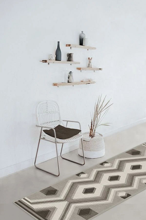 Give your space a retro-chic vibe with our Anza Warm Grey Rug. This geometric rug features a weave-like pattern, with sleek lines and angular shapes in neutral tones of taupe and oyster.