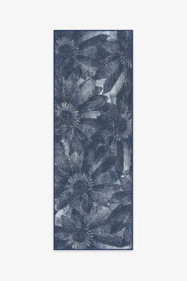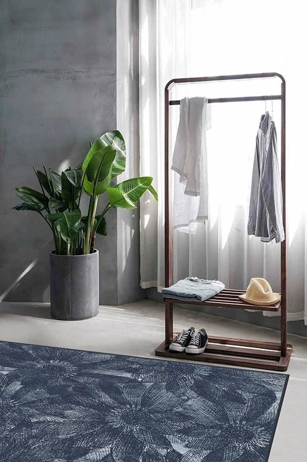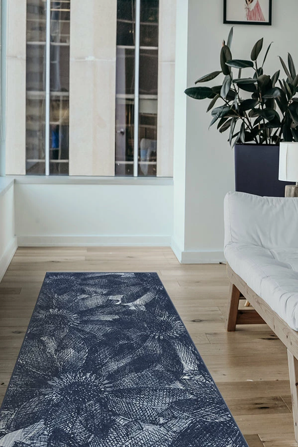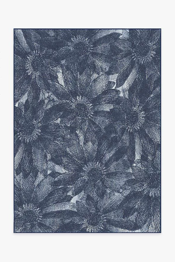 Our floral Aprilios Navy rug uses crosshatching to create a tonal and textural effect in elegant hues of blues and white.