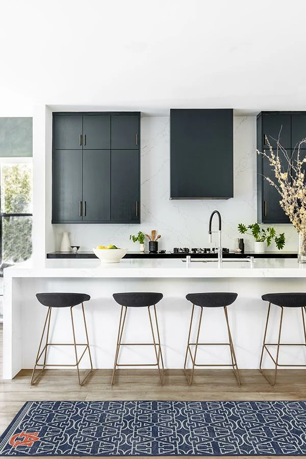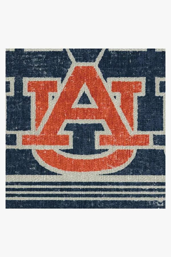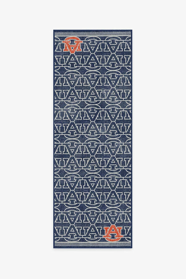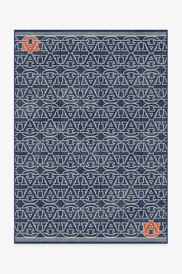 “Auburn Family, this one’s for you! This Auburn University rug features a repeating pattern of the school logo in white on a navy background, accented with two Auburn orange logos in the opposite corners. Water-resistant, stain-resistant, and machine-washable.