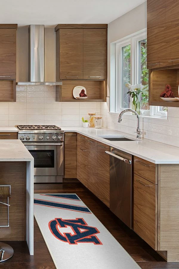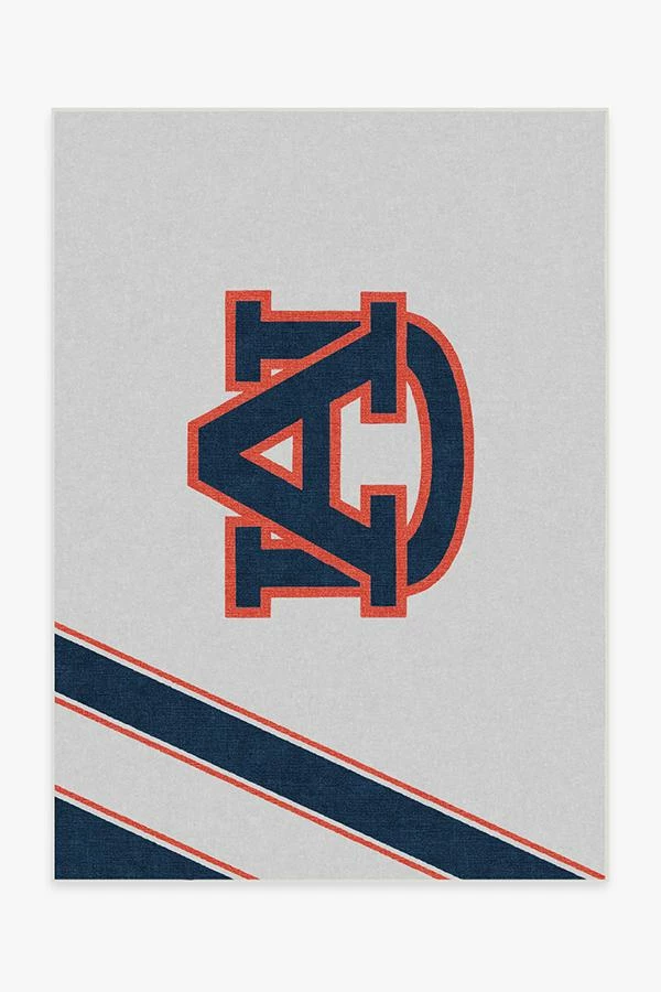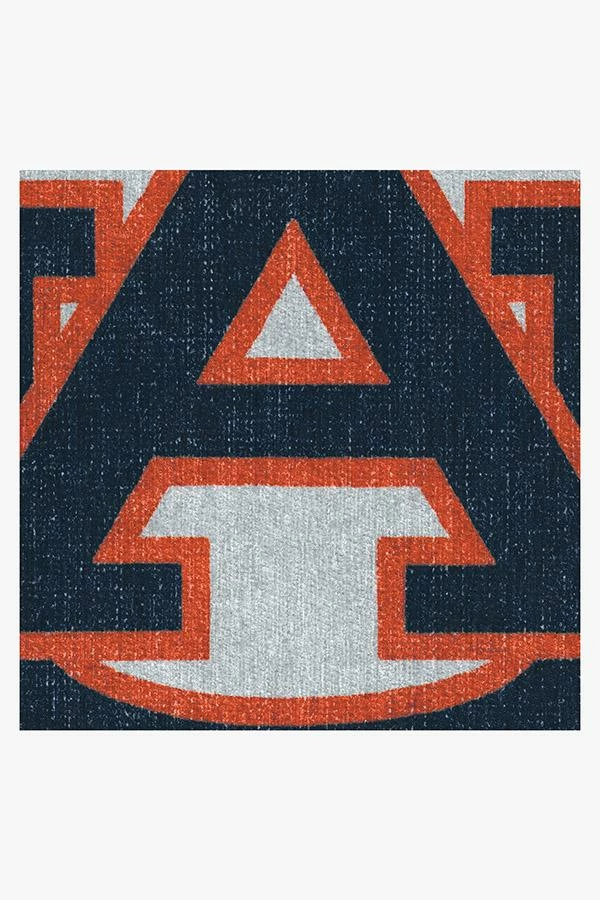 War Eagle! Root for the Tigers with this Auburn University rug featuring the school’s logo in orange and blue, centered on a light grey background with orange and blue accent stripes in the corner. Water-resistant, stain-resistant, and machine-washable.