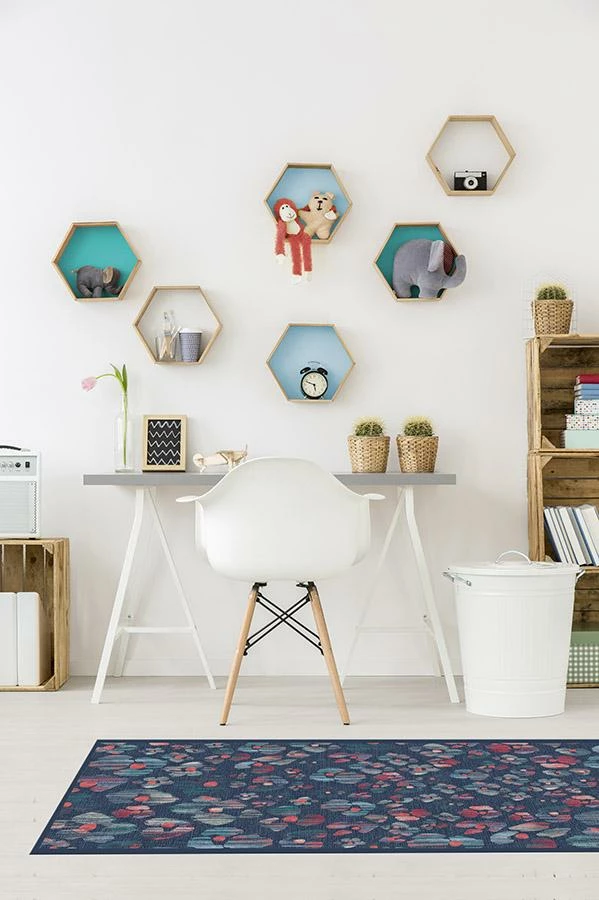 Our contemporary Ayana Sapphire rug displays a field of beautifully striated flowers in vibrant colors on a dark blue background.