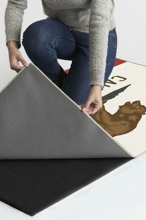 Show your Cali Love all year round with the California Red Rug. This design features Monarch, the iconic California Bear in rich tones of chocolate brown and beige walking on a patch of sage green above a strong solid bar of rich tomato red.