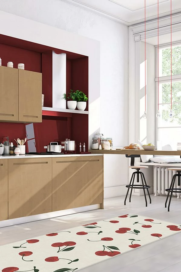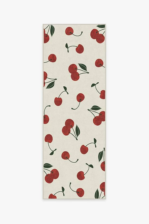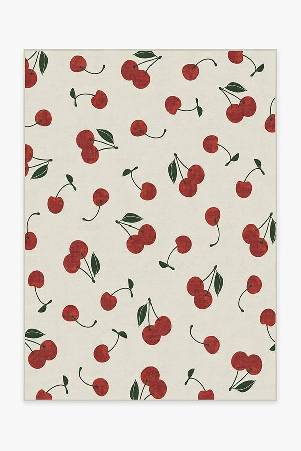 Cherry Red Rug brings a chic and sophisticated appeal to your home’s decor. Featuring hand-drawn cherries, high fashion’s new favorite fruit, this design makes use of bright tomato and merlot red, accented with pops of leaf green on ivory.