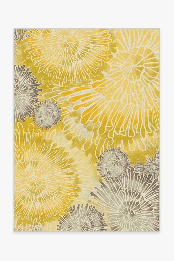 Your home will enjoy a splash of sunshine when you decorate with our Chrysanthemum Yellow rug. This delicately hand-drawn, floral motif bursts with vibrant colors of Danish and dandelion yellow, Polenta, mushroom and silver taupe. Perfectly suitable to bring seasonal style and decorative energy to your current home furnishings.