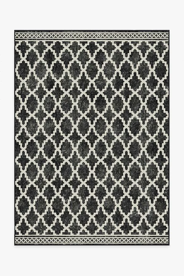 An elegant, statement-making design. Our Cleo Trellis Black Rug features a repeating pattern inspired by the Moroccan trellis motif with bordered ends in a black and white color palette. The extra-durable, machine-washable material is perfect for both outdoor and indoor use, especially high-traffic areas and those exposed to the elements.