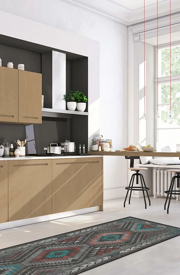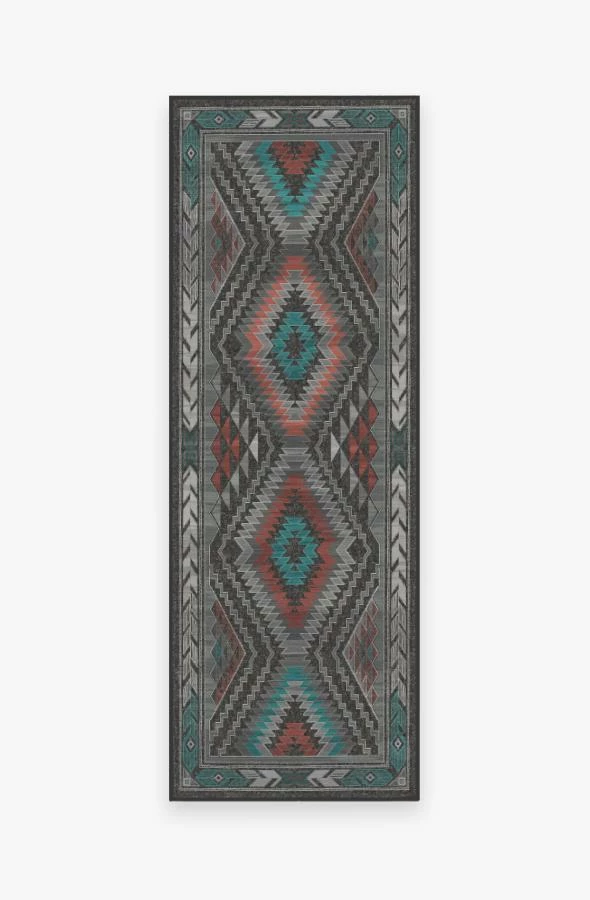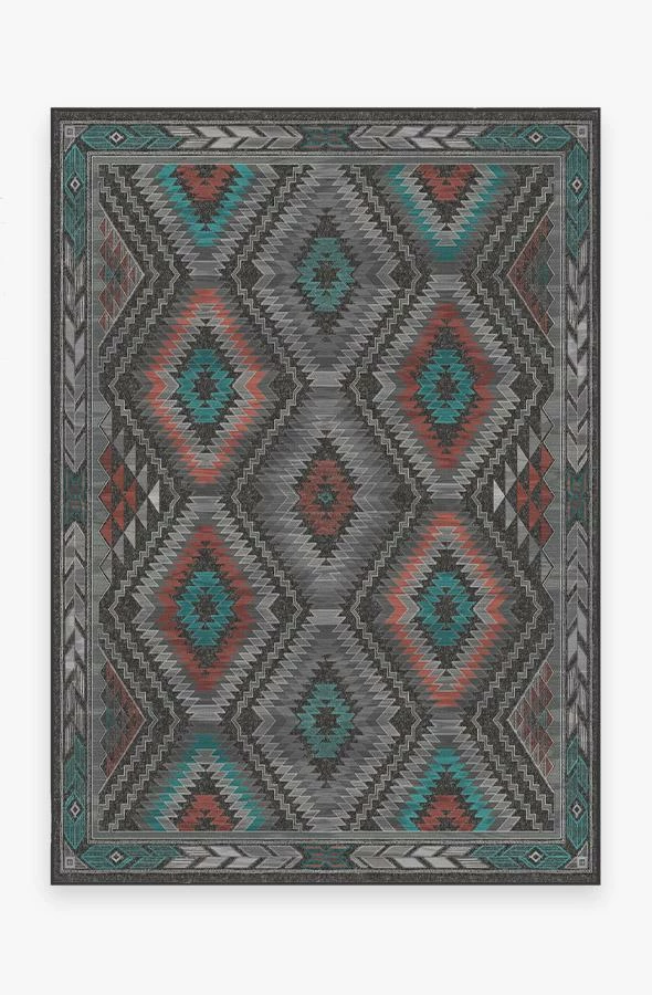 The Dessa Diamond Charcoal Rug turns up the energy with its traditional diamond motif. High-contrast tones of charcoal, brick red, and teal blue highlight this striking geometric motif; while two-toned zigzags and triangles line the borders, creating a dynamic effect that commands attention.
