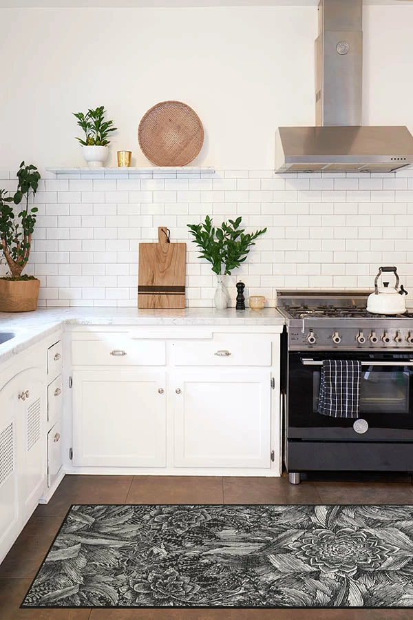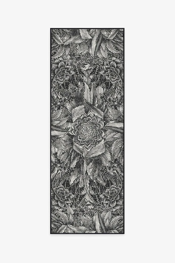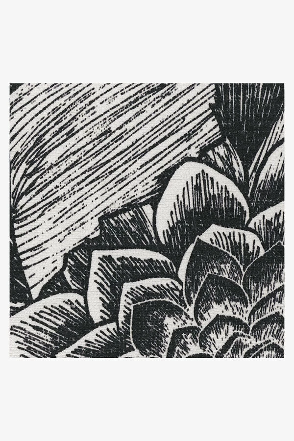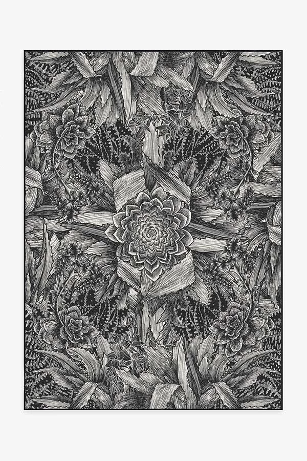Our Echeveria Black Rug is a dark and dreamy take on classic florals. Rendered in black, grey, and white, this modern floral rug features a large, rose-shaped succulent at the center, surrounded by thorns, leaves, and smaller echeverias.