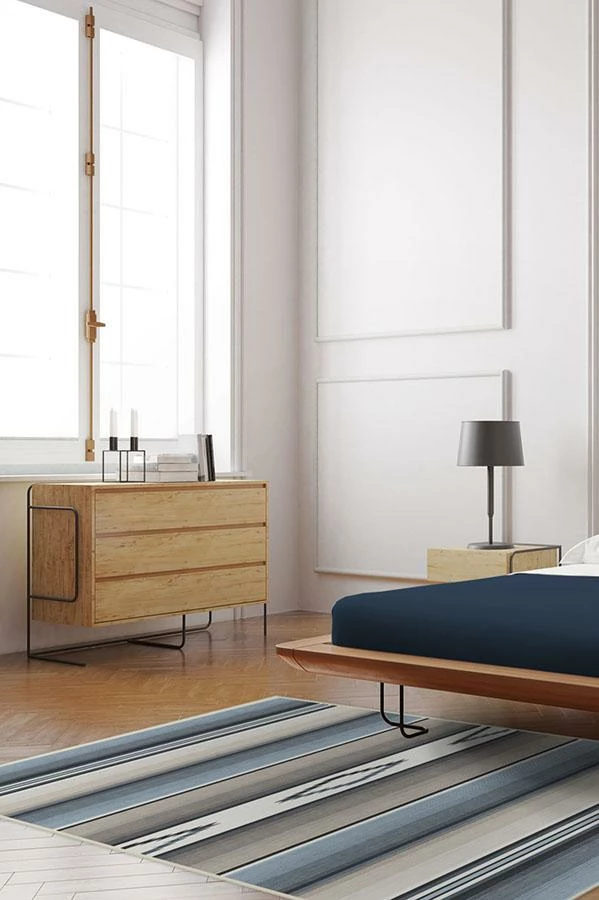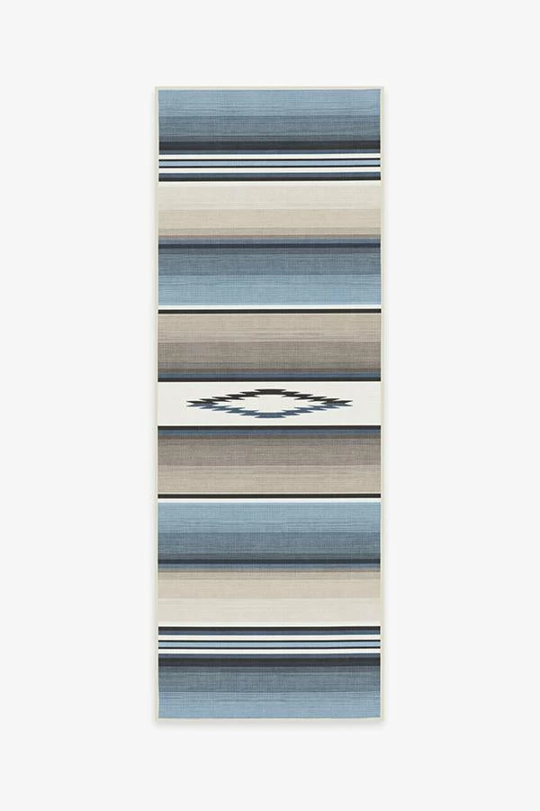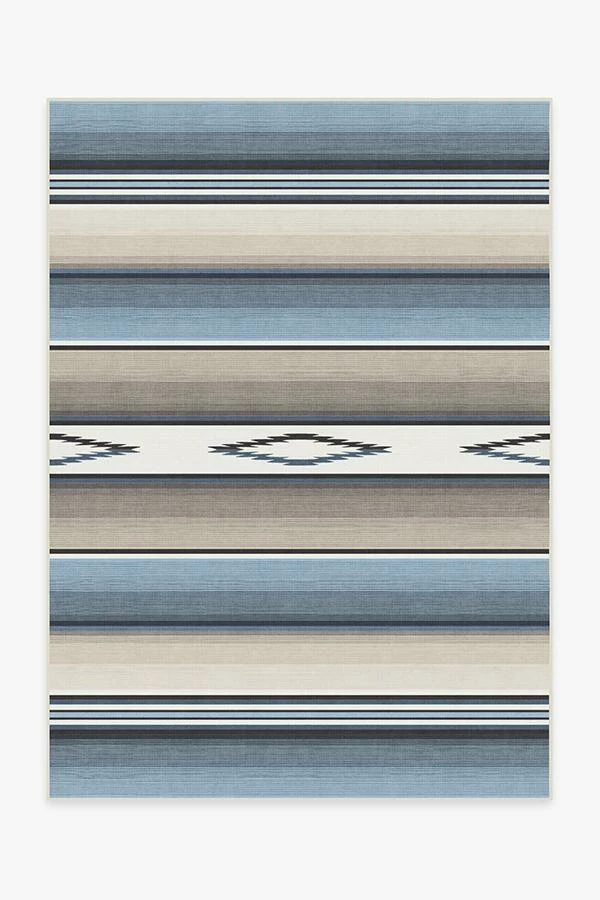Our Falsa Stripes Blue Rug takes inspiration from the classic Mexican serape blanket. This traditional weave motif features ombre stripes of slate blue, beige, and pewter hues with pops of nautical blue, acting as a sophisticated accent with authentic south-of-the-border charm.