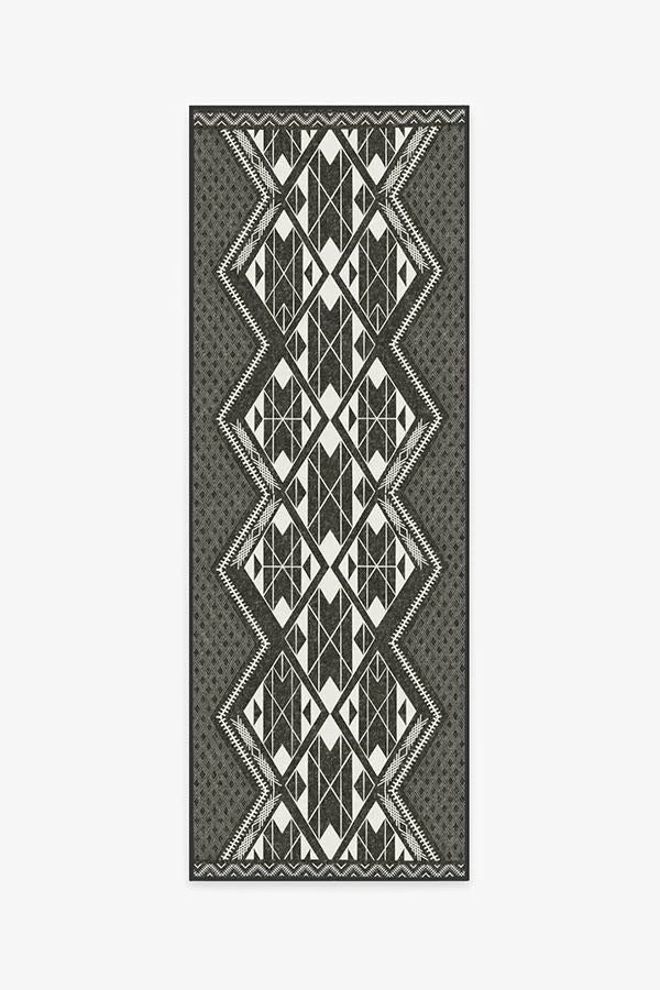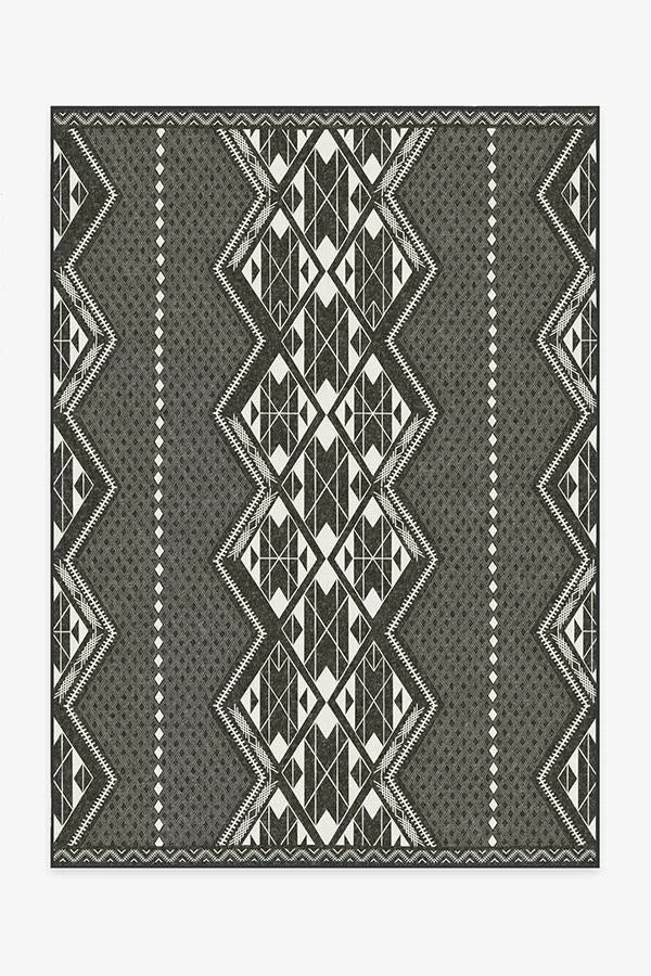 Adorn your floor with our Halona Charcoal Rug. It features geometric triangle and diamond shapes in contrasting tones of pearl and charcoal, a Southwestern-inspired motif that represents the metamorphosis of a butterfly.