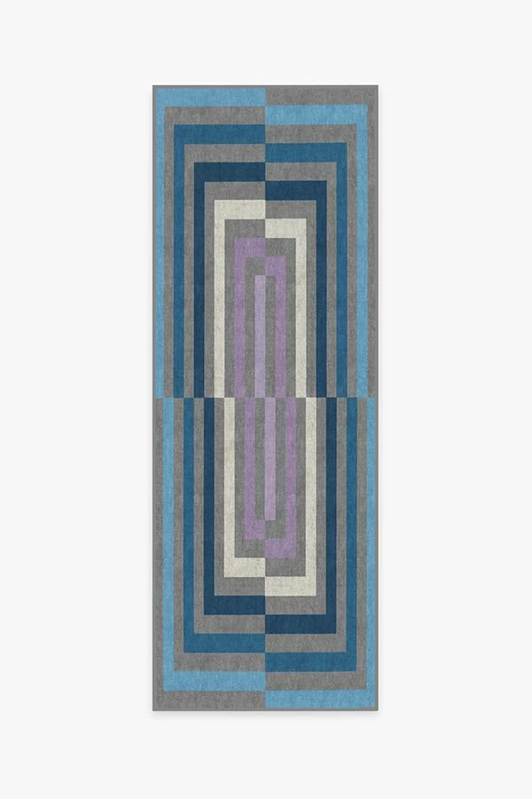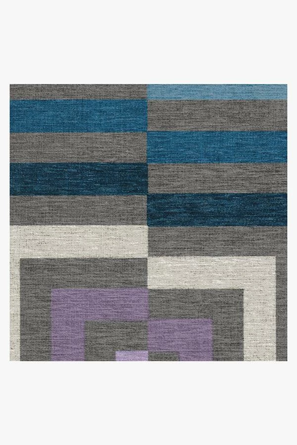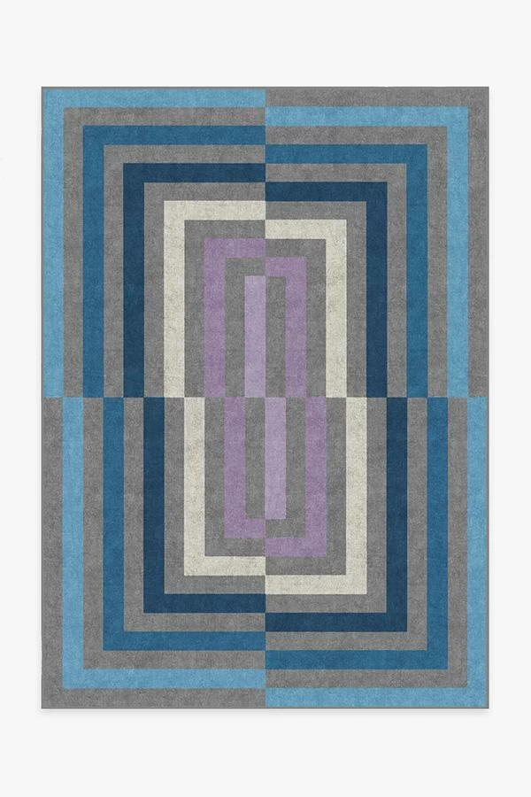 Artsy meets mystique. This optical art rug features an uneven square pattern in eye-popping shades of pearl, ocean blue, ultraviolet, and neutral grey. Water-resistant, stain-resistant, and machine-washable.