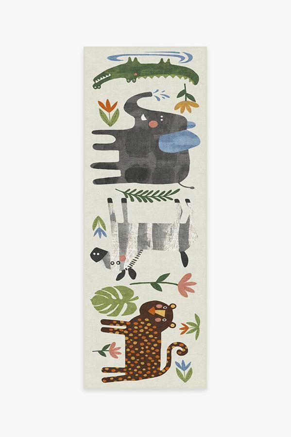 Little explorers will love this crew of critters on our Jungle Safari Multicolor Rug. Tinted in watercolor hues of blue, green, and yellow, this rug features cheerful animals ��� lion, zebra, giraffe, elephant, and crocodile ��� roaming among rubber trees, leaves, and flowers, adding a wildly whimsical touch to any child’s space.