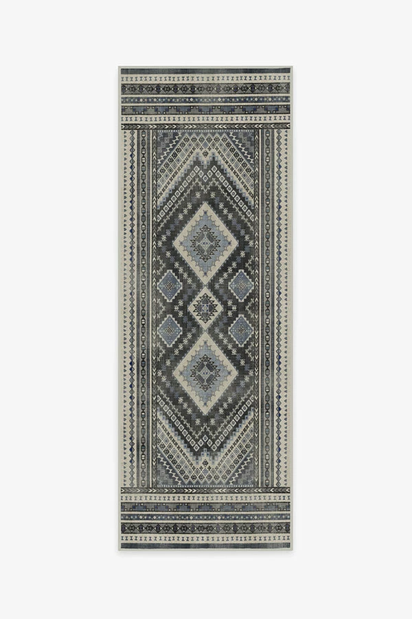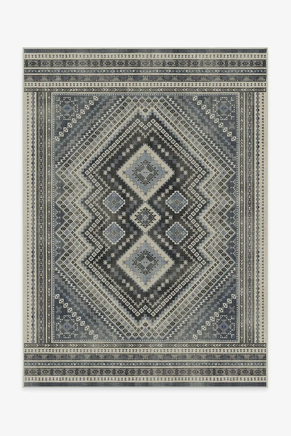 Geometric with a rustic appeal. This rug features a central diamond medallion surrounded by repeating patterns in shades of cream, denim blue, and slate blue on a charcoal grey background. Water-resistant, stain-resistant, and machine-washable.
