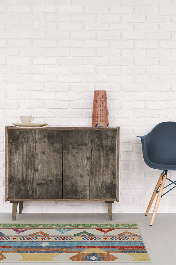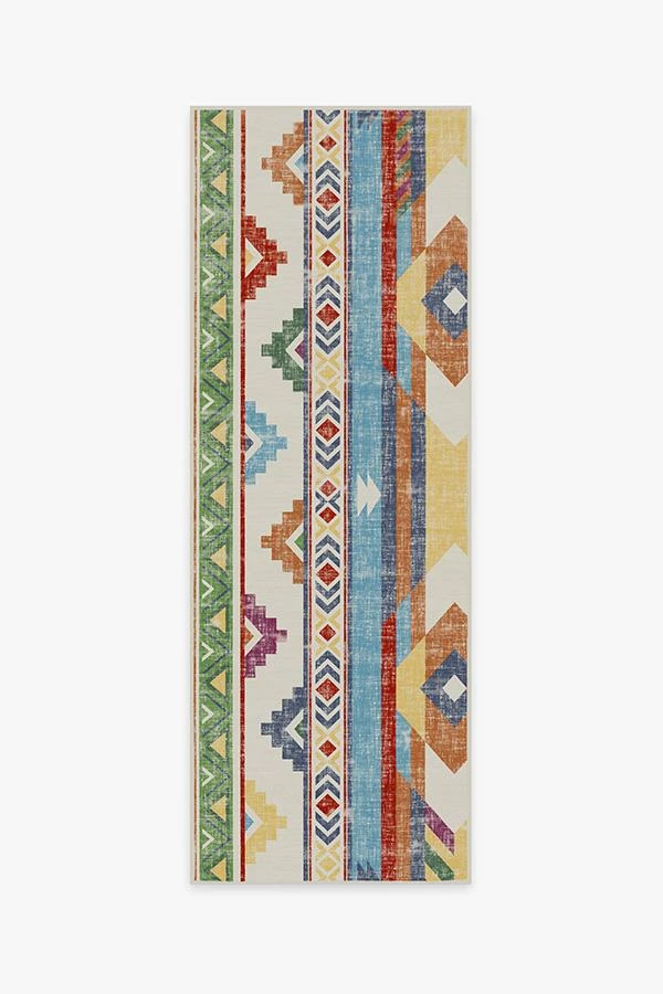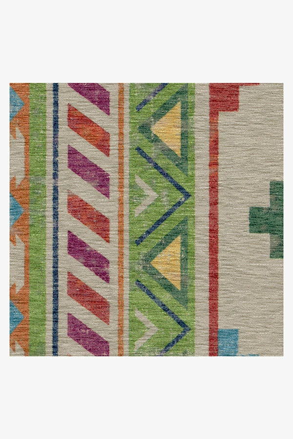 Instantly elevate your home decor with Kilim Batik Multicolor Rug. Inspired by the intricate and geometric designs of Turkish kilim rugs, this brightly colored rug features a brilliant mix of silver taupe, farmhouse red, rust orange, Danish yellow, granny apple green, seafoam blue, and magenta. This unique floor decor will enhance any modern, eclectic, or bohemian-style interior.