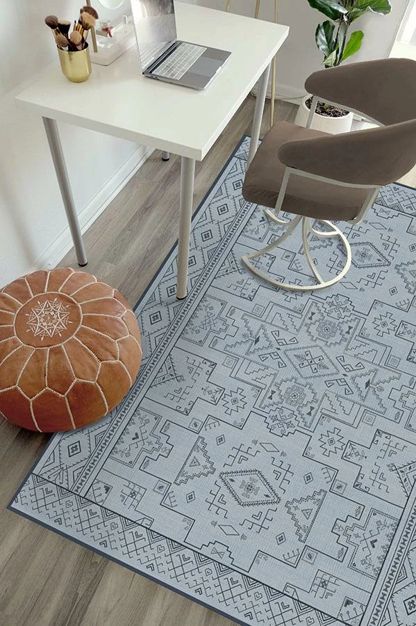 Leelu Blue Overdye Rug is inspired by the highly stylized designs of Caucasian rugs. Featuring geometric lines and shapes, softened by a bicolor scheme of neutral grey and slate blue, this rug gives old-world appeal to any modern home.