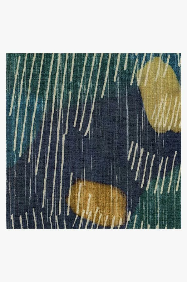 The abstract floral design of our Leona Midnight Blue rug uses overlapping hatch marks and watercolor brushstrokes in blues and pops of soft yellow.