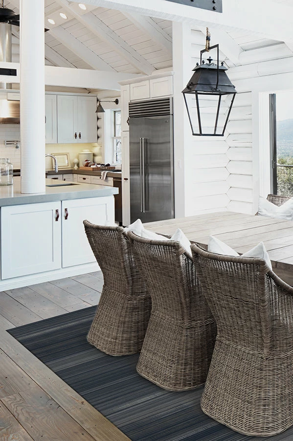Make a decorative statement with this striking, Linear Striped Navy rug. The distressed, finely striped pattern is skillfully designed by intermingling tones of fog, silver, light grey, navy black, smoke and pearl. This piece will instantly anchor any room in your modern, contemporary or coastal style home.
