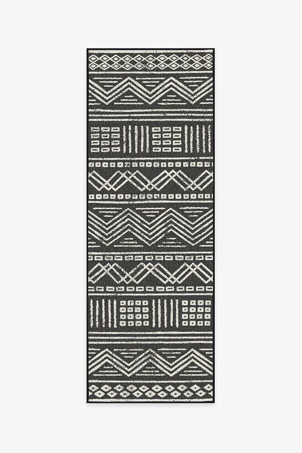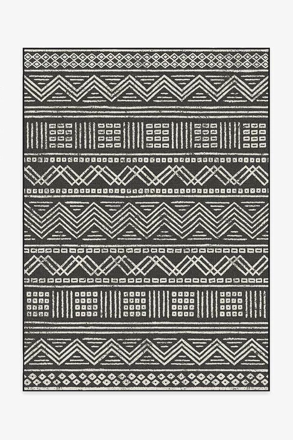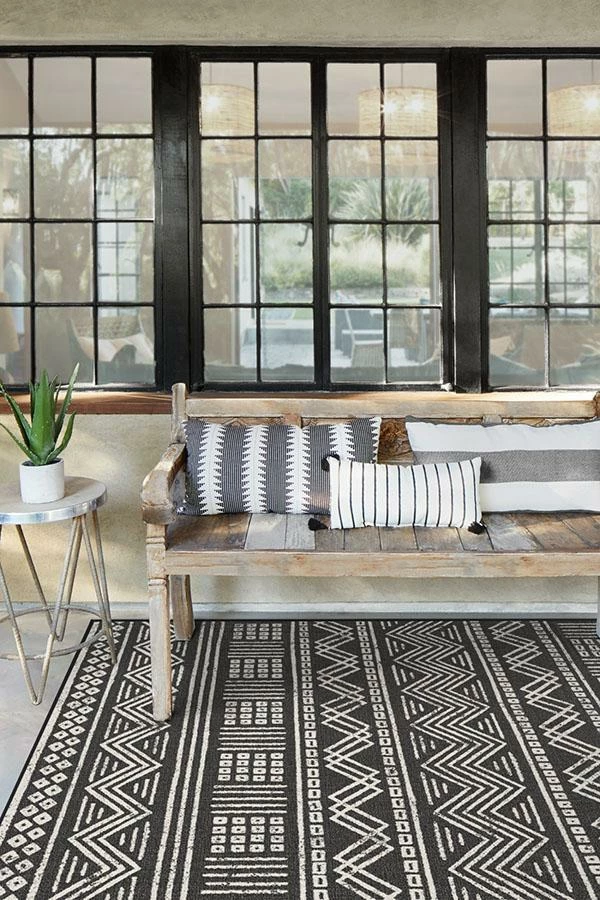 Boho meets geometric. A striking pattern of zigzags, lines, and shapes gives life to this black and white outdoor rug. Durable, stain-resistant, and machine-washable, this rug will hold up well in any high-traffic indoor or outdoor spaces.