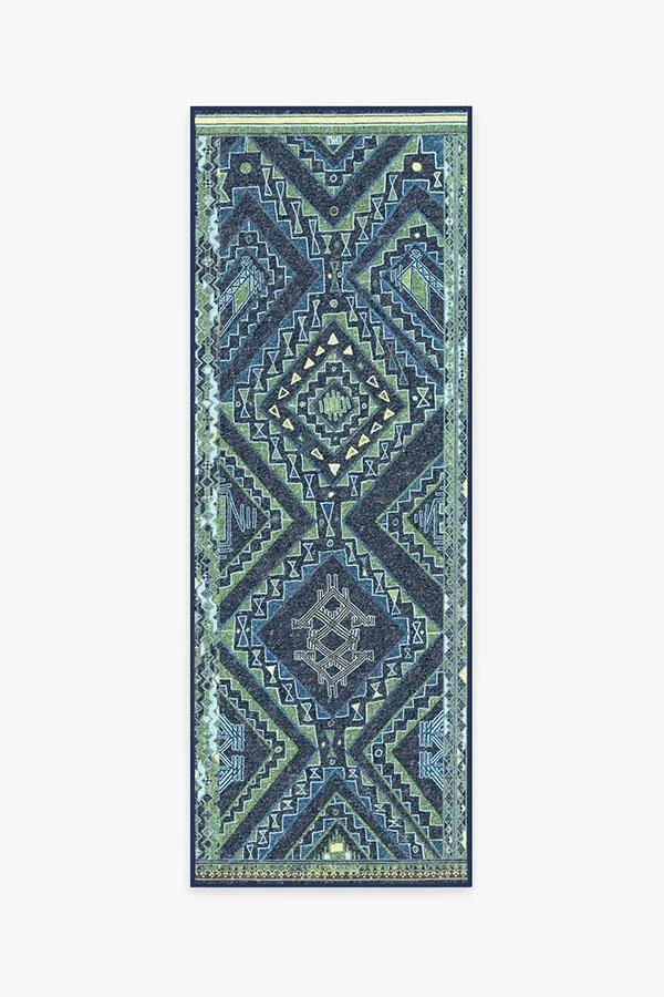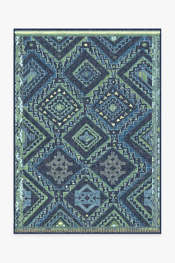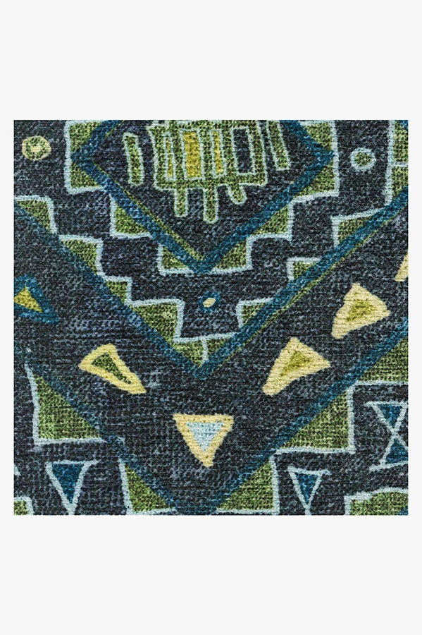 Furnish your home with timeless beauty and richness by laying down our Lunja Midnight Rug. Paying homage to the handwoven Moroccan rug design, this abstract, geometric motif is displayed in a dramatic blend of dark ocean blue, candy apple green, chartreuse, and leaf green.