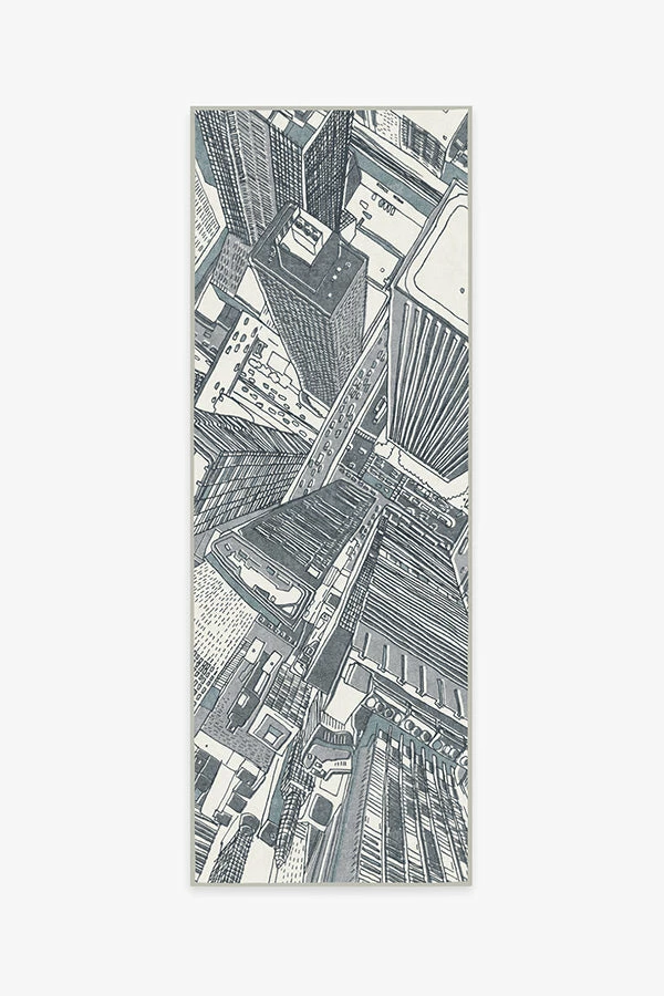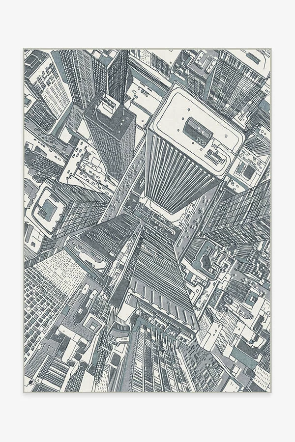 Take your contemporary home decor to new heights with Lux Slate Blue Rug, which showcases an aerial view of a modern city skyline. Featuring clean lines, hand-drawn in various tones of blue and green on pearl, this rug design perfectly illustrates the quintessential urban life.