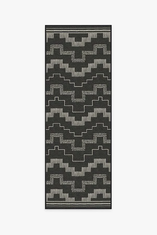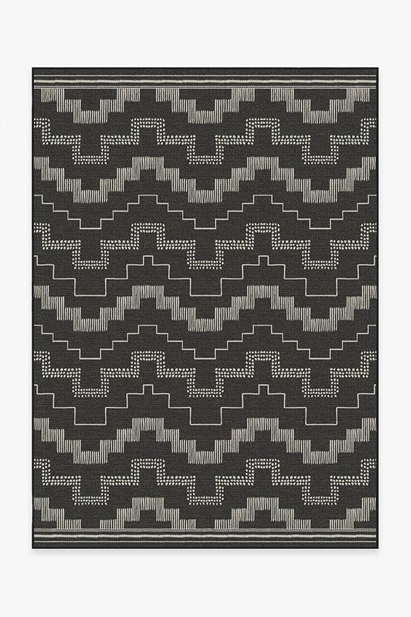 An intricate statement-maker. Our Meseta Black Rug features a modern geometric design showcasing layers of lines, dots, and blocks resembling rocky terrains tinted in high-contrast colors of black and off-white. The extra-durable, machine-washable material is perfect for both outdoor and indoor use, especially high-traffic areas and those exposed to the elements.
