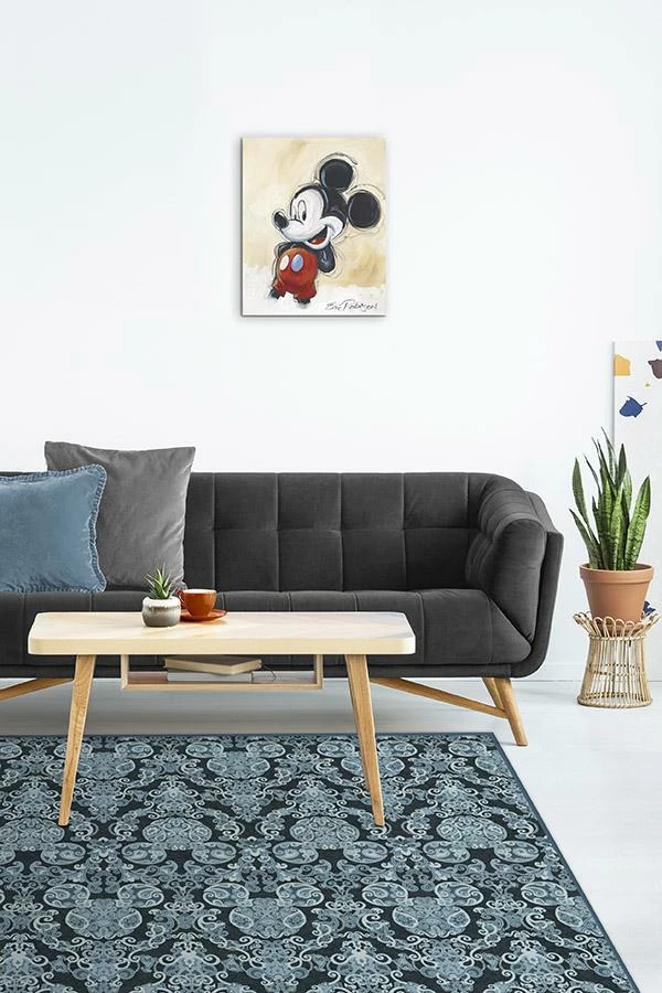Mickey Damask Navy Rug puts a Disney stamp on the classic, damask pattern. Rendered in various hues of slate blue, this rug features hand-drawn figures of Mickey Mouse subtly woven into an elaborate pattern, radiating a chic vibe that appeals to all ages.