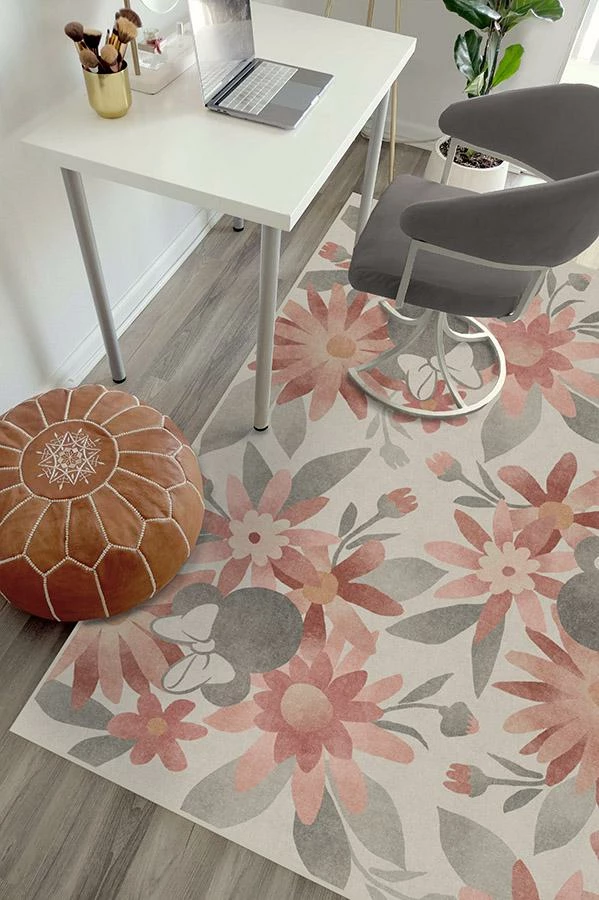 Minnie Floral Rosewood Rug is made to bring color and sunshine to any nursery, kids room or playroom. Featuring autumn orange and rust red floral bouquets, punctuated by Minnie Mouse’s iconic head and bow silhouette in grey, this Disney-themed rug is a delightful addition to any space.