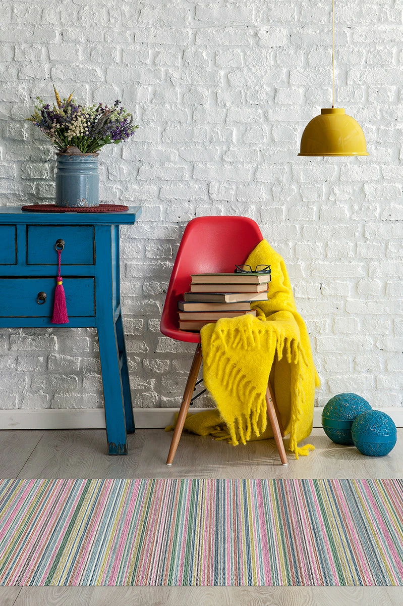 Our Multi Stripe Polychrome rug will daringly infuse a burst of color to your home decor. The contemporary, woven textured motif comes to life with a vibrant coloring of pearl, coconut, ocean blue, concord grape, fuchsia pink, tomato red, evergreen, seafoam blue and limoncello. This unique, decorative piece will bring a playful and fun accent to your contemporary, modern or eclectic furnishings.