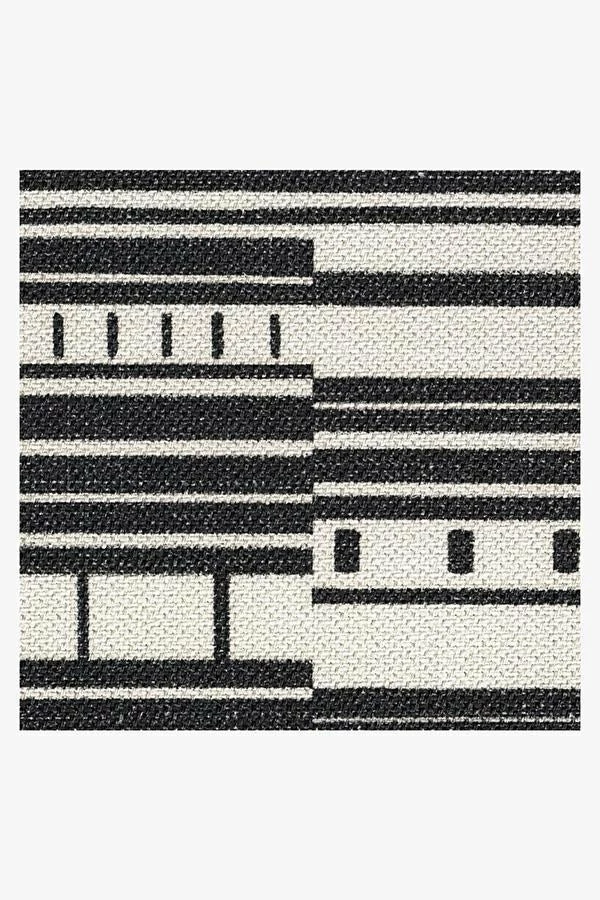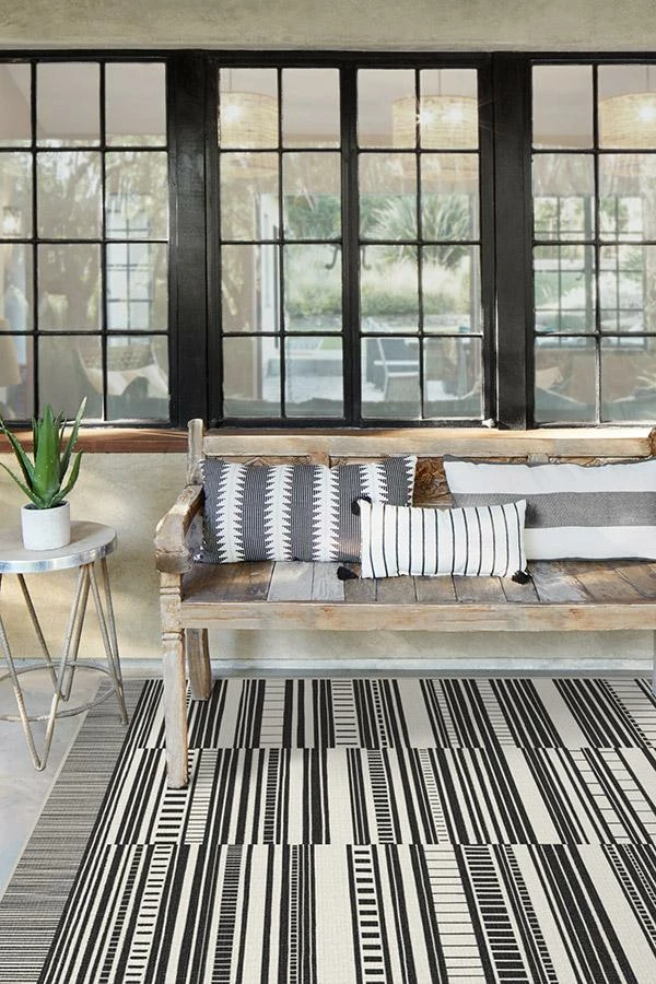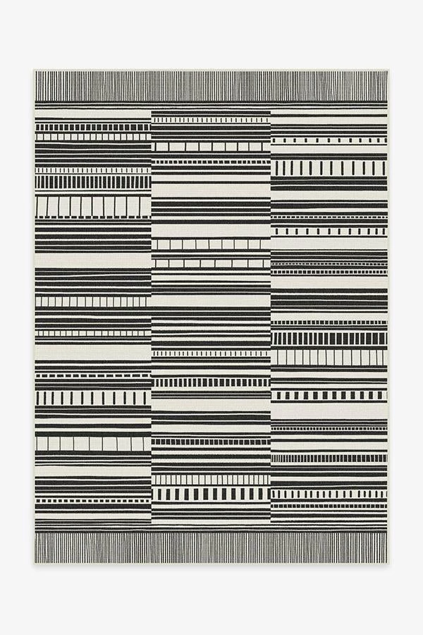 Stripes that make a statement. This black and white outdoor rug features a playful broken stripe pattern, with top and bottom fringe-like borders for added detail. Made with a machine-washable, extra-durable material that makes cleaning it a breeze.