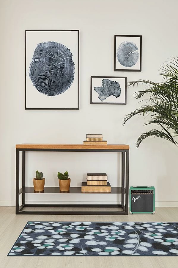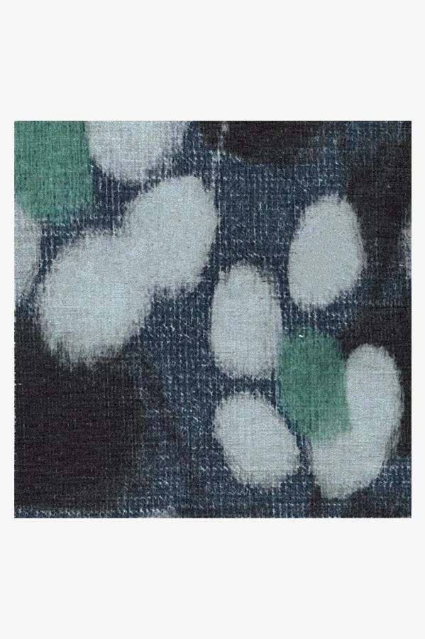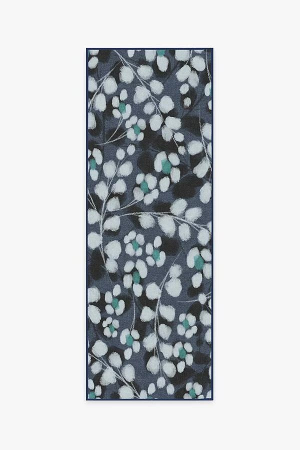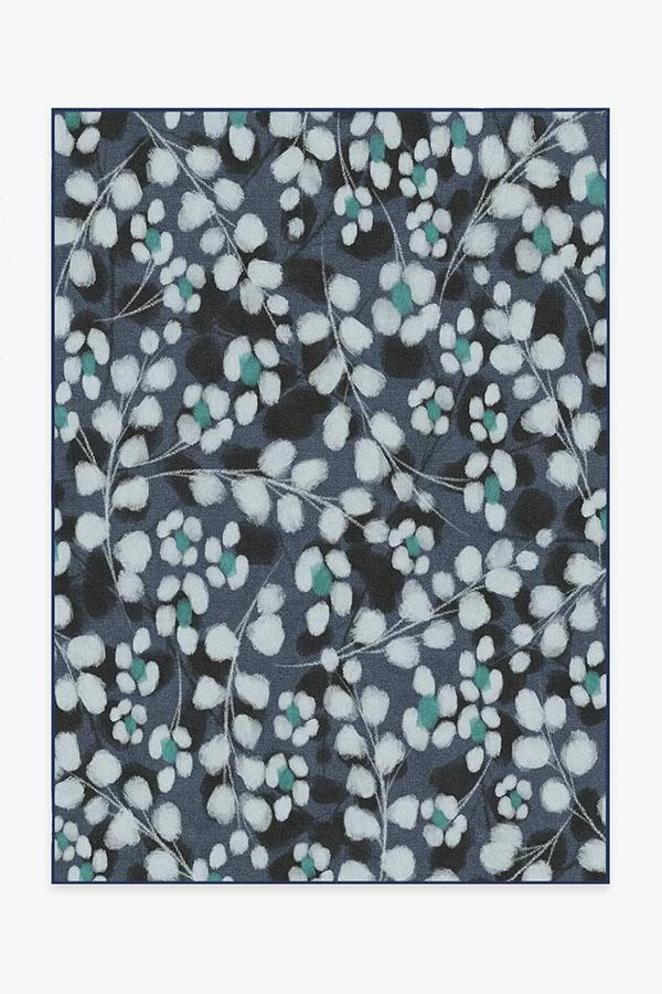 The floral motif of our contemporary Rosette Blue rug uses watercolor brushstrokes in soft blues and silver on a field of navy.