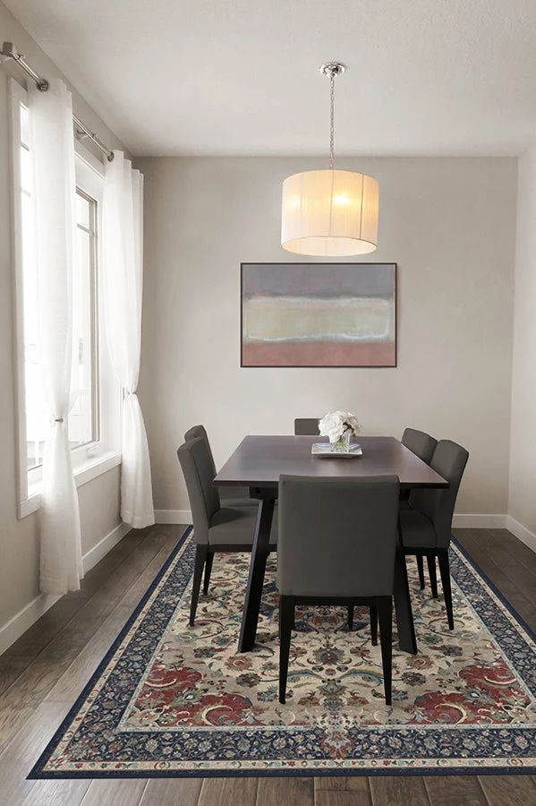 The Sima Royal Blue features a globally inspired floral design. Its leafy floral motif is accentuated by a deep blue border and rich red corner accents.