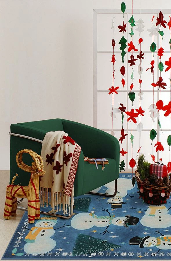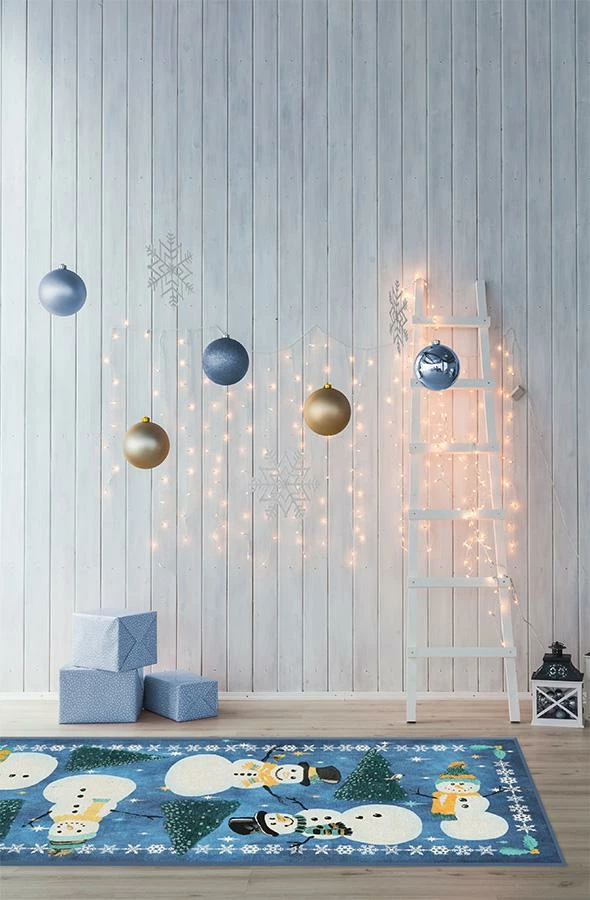 Enjoy the wintry weather without the frostbite with our Snowy Soiree Frost Rug. Featuring frosted fir trees and smiling snowmen adorned in jaunty top hats, beanies, and scarves, this winter wonderland-themed rug is sure to delight kids and kids at heart all season long. Made from our water-resistant, stain-resistant, and machine-washable low-pile Chenille material.