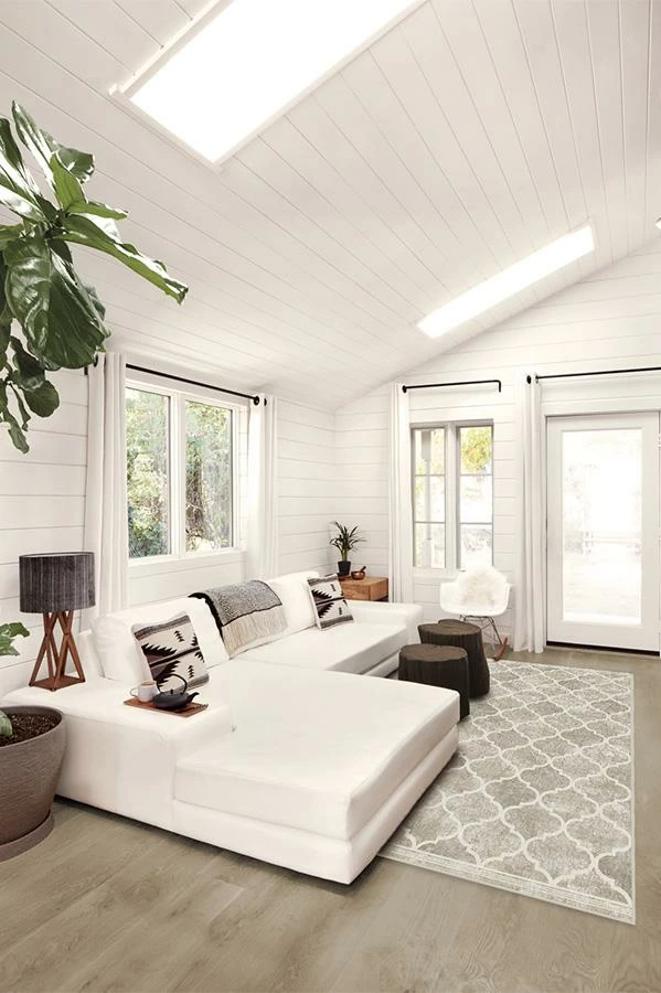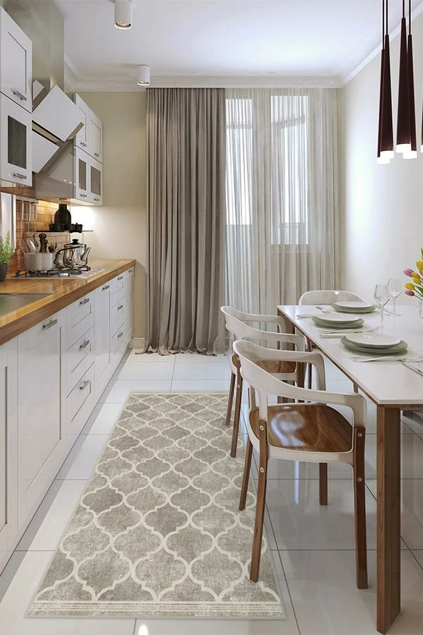Our contemporary Terali Ash Grey Rug takes inspiration from Morrocan rug designs. It features a trellis pattern in mascarpone white, set against a textured backdrop of grey taupe.
