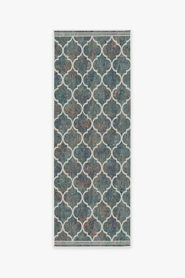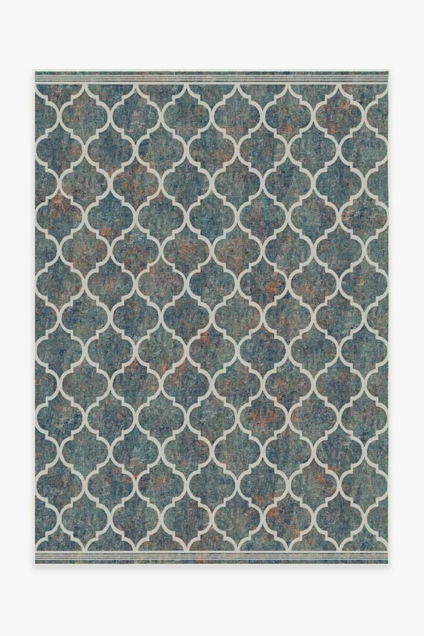 A classic pattern with a colorful twist. Inspired by Moroccan rug designs, this rug features our well-loved trellis pattern in off-white on a textured, multitonal backdrop of teal, navy blue, and bright orange. Water-resistant, stain-resistant, and machine washable.