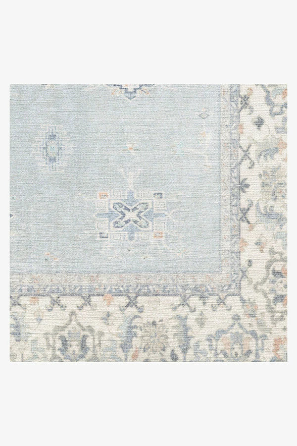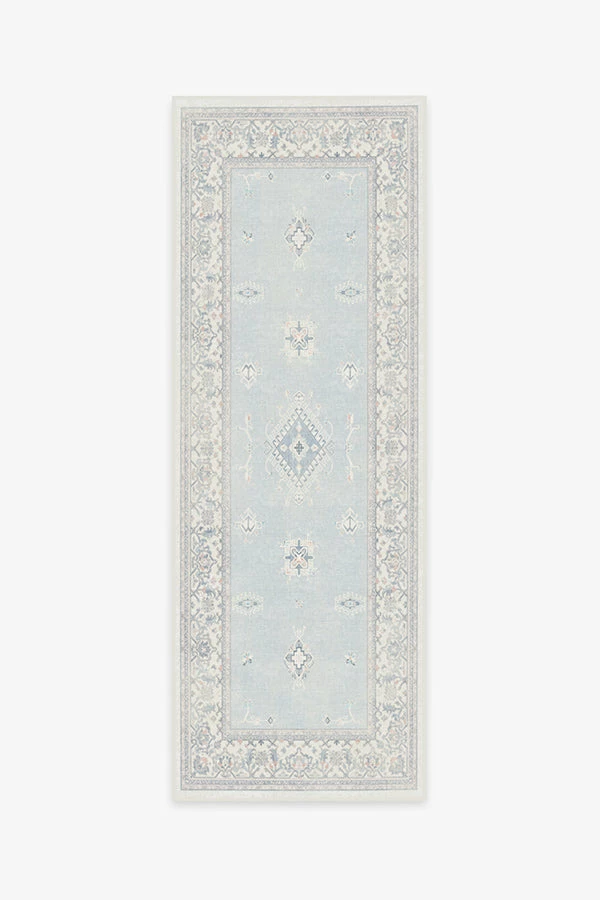 Total softy. Our Verena Soft Blue Rug delights your space with a sky blue background adorned with a grid of geometric shapes reminiscent of embellished jewels. This Persian-style design encapsulates a feeling of youth and tranquility with its shades of light blues and hints of soft pinks amongst its distressed texture. Made from our water-resistant, stain-resistant, and machine-washable low-pile Chenille material.