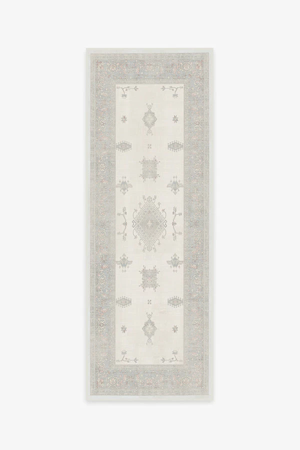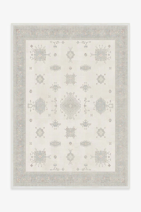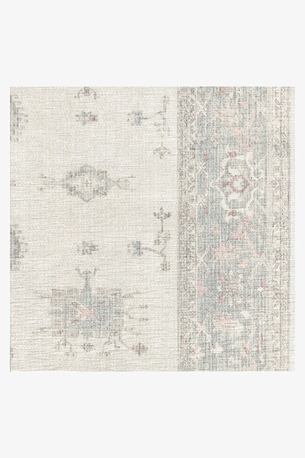 Peaceful and calm. Our Verena White Opal Rug puts a modern farmhouse spin on a traditional Persian-style design. Showcasing different shades of neutral greys, light pinks, and dusty rose accents, this design features an ornate border around a grid of geometric shapes reminiscent of embellished jewels. Made from our water-resistant, stain-resistant, and machine-washable low-pile Chenille material.
